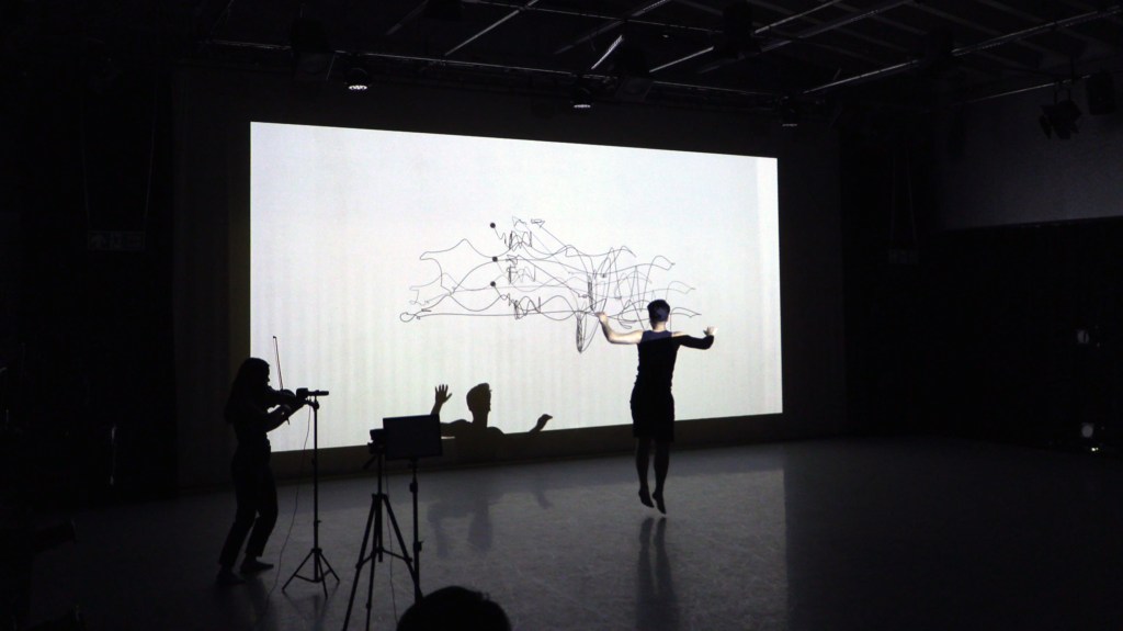 “Trail of Moment” is a series of performance drawings inspired by Rudolf Laban’s Labanotation, a system that analysis and records human movement into 2D notation. Similarly, this project showcases the intuition and creativity of a dancer and violinist as they engage in a collaborative improvisational process through drawing. The project employs Kinect to capture specific features of the dancer’s body, which are then projected onto a screen as moving dots and lines of trail, effectively transforming the dancer into a drawing tool that visually represents moments of kinaesthetic creativity inspired by the violinist’s improvisation.