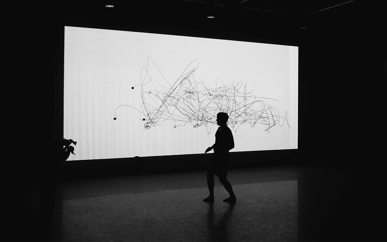 “Trail of Moment” is a series of performance drawings inspired by Rudolf Laban’s Labanotation, a system that analysis and records human movement into 2D notation. Similarly, this project showcases the intuition and creativity of a dancer and violinist as they engage in a collaborative improvisational process through drawing. The project employs Kinect to capture specific features of the dancer’s body, which are then projected onto a screen as moving dots and lines of trail, effectively transforming the dancer into a drawing tool that visually represents moments of kinaesthetic creativity inspired by the violinist’s improvisation.