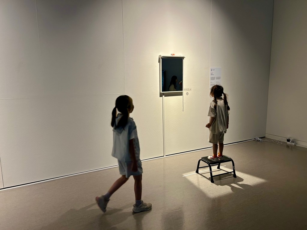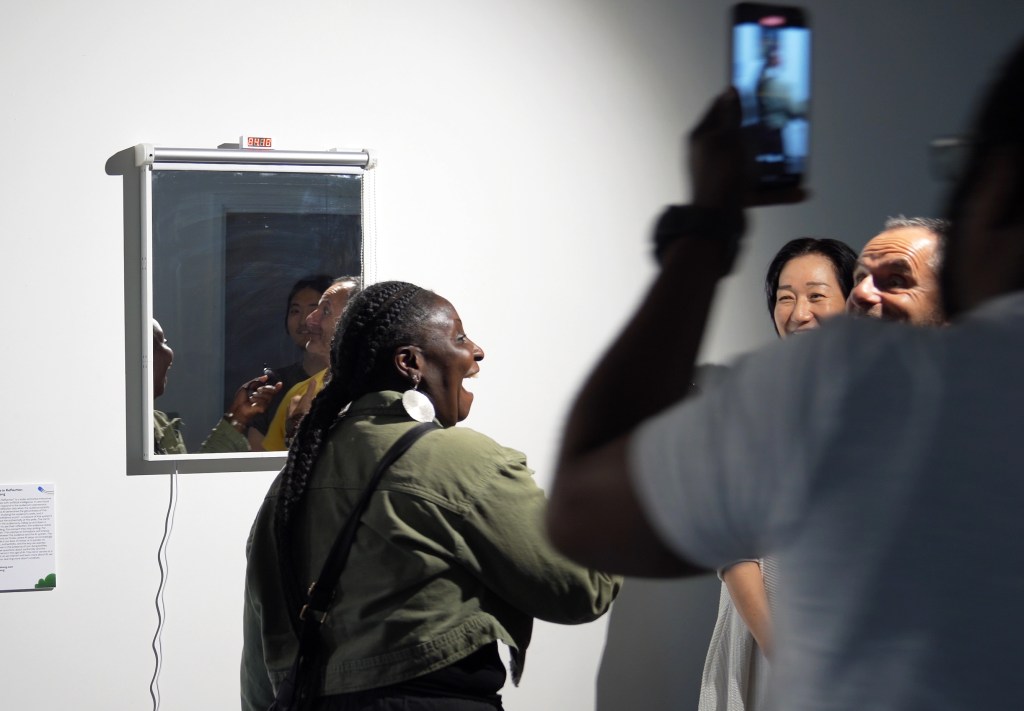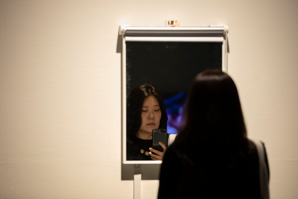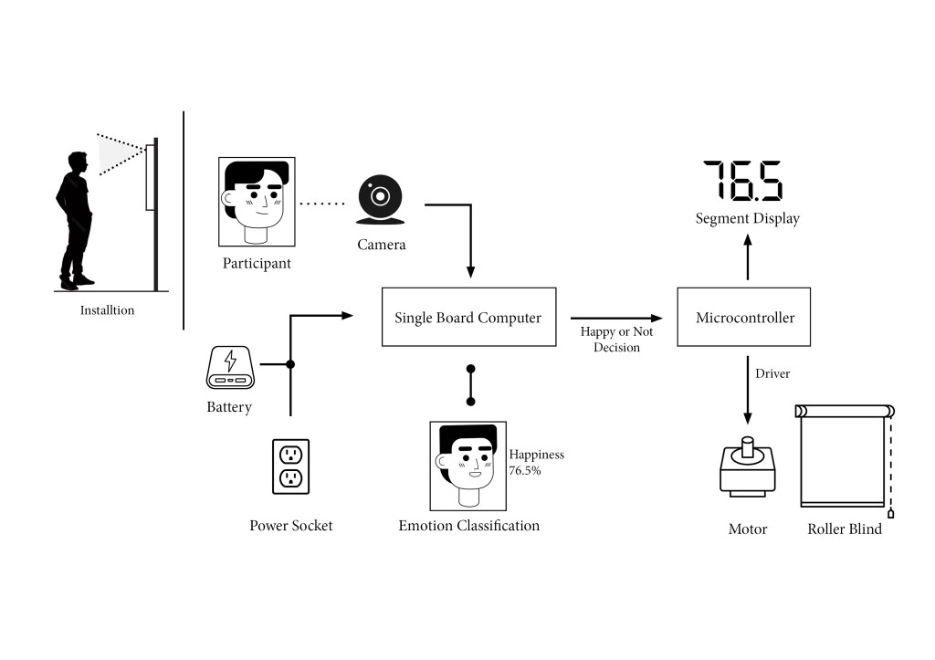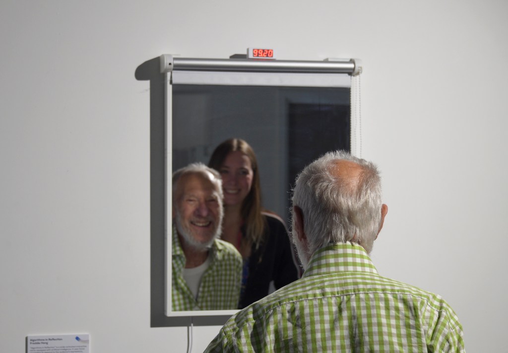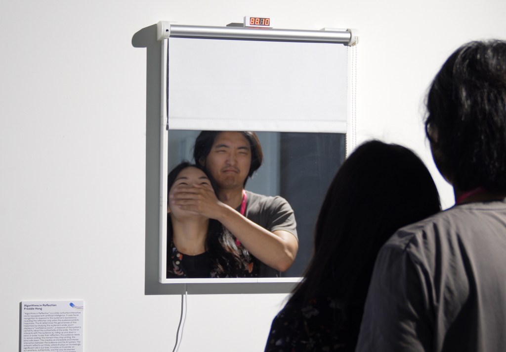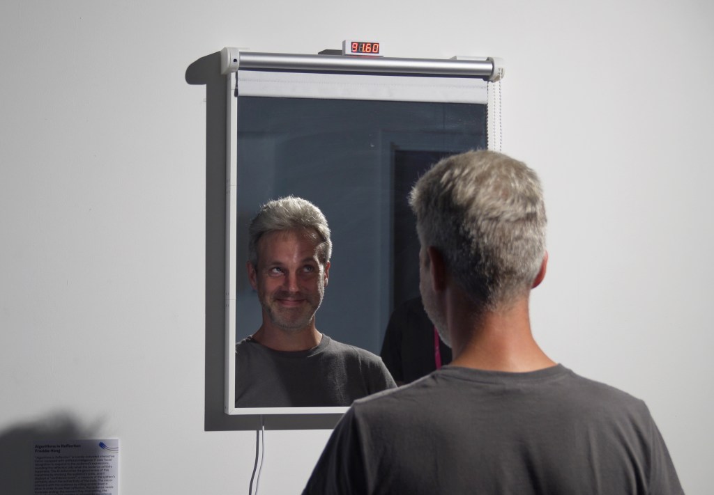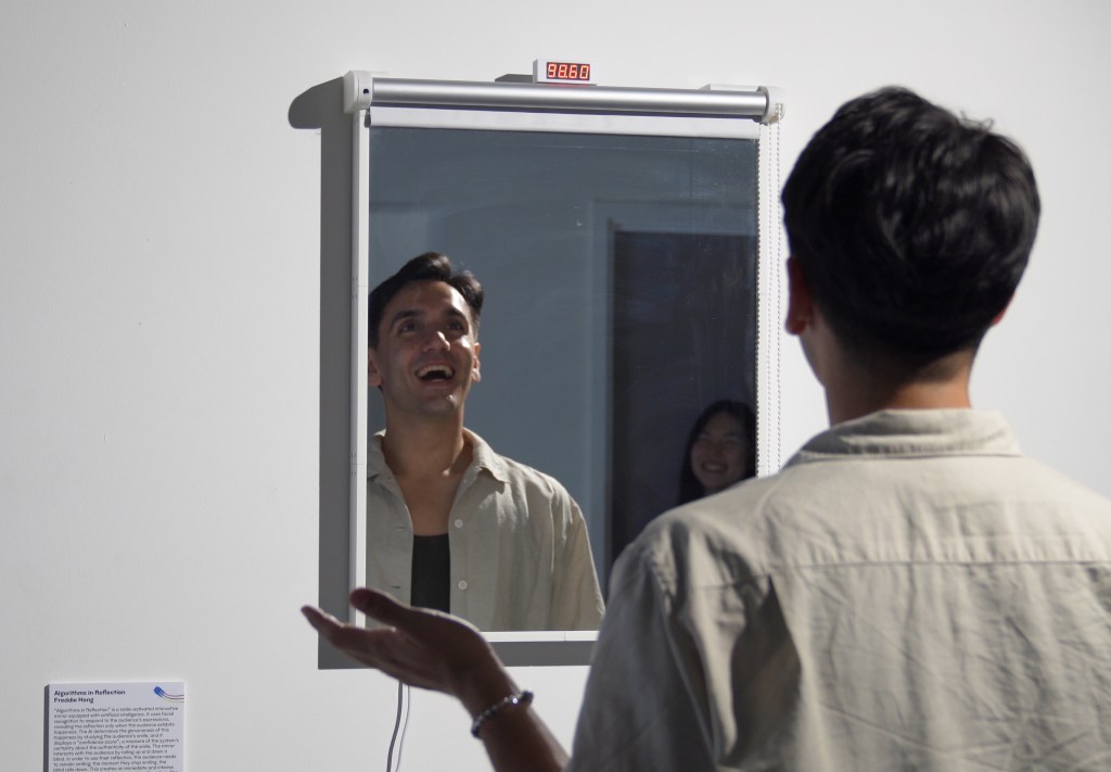 Algorithms in Reflection is a series of interactive mirrors with embodied AI that responds to facial expressions. The work initially began as a single mirror that responded exclusively to happiness. Using a camera and a convolutional neural network trained on the FER-2013 dataset, it detects when a viewer smiles and reveals their reflection only when they appear happy. The AI assesses the authenticity of the smile and generates a “confidence score,” which measures its certainty about the smile’s genuineness. The mirror interacts with viewers by raising or lowering a blind. To see their reflection, they must keep smiling. If they stop, the blind falls and hides their reflection. This creates an immediate and immersive exchange between the viewer and the AI system. The artwork highlights the growing influence of AI in our everyday life. This mirror explores what it means to express emotions to a non-human entity and have them acknowledged by it. We are already accustomed to smiling and laughing in social interactions to appear happy, whether genuine or not. But does it feel different when we must convince AI? In the end, this mirror shows us that as we interact more with AI, we are also reflecting on ourselves, reminding us of our own nature as social beings.