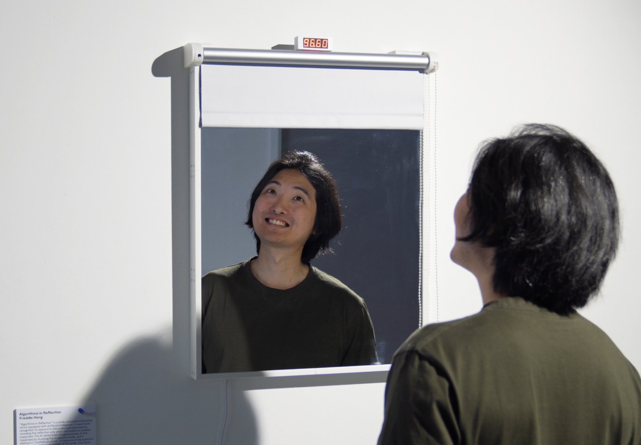 Algorithms in Reflection is a series of interactive mirrors with embodied AI that responds to facial expressions. The work initially began as a single mirror that responded exclusively to happiness. Using a camera and a convolutional neural network trained on the FER-2013 dataset, it detects when a viewer smiles and reveals their reflection only when they appear happy. The AI assesses the authenticity of the smile and generates a “confidence score,” which measures its certainty about the smile’s genuineness. The mirror interacts with viewers by raising or lowering a blind. To see their reflection, they must keep smiling. If they stop, the blind falls and hides their reflection. This creates an immediate and immersive exchange between the viewer and the AI system. The artwork highlights the growing influence of AI in our everyday life. This mirror explores what it means to express emotions to a non-human entity and have them acknowledged by it. We are already accustomed to smiling and laughing in social interactions to appear happy, whether genuine or not. But does it feel different when we must convince AI? In the end, this mirror shows us that as we interact more with AI, we are also reflecting on ourselves, reminding us of our own nature as social beings.
